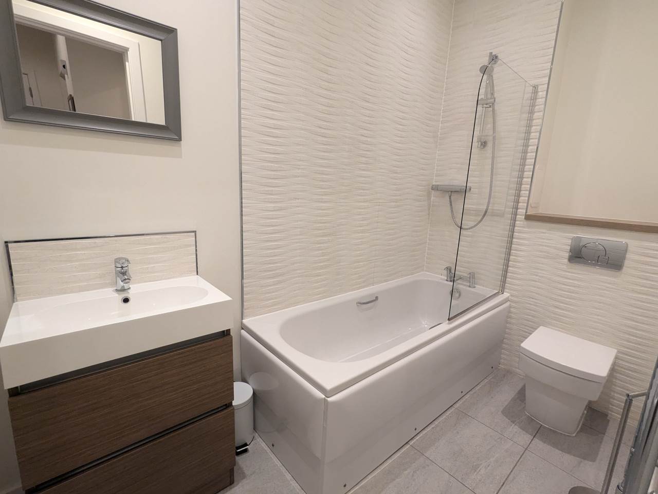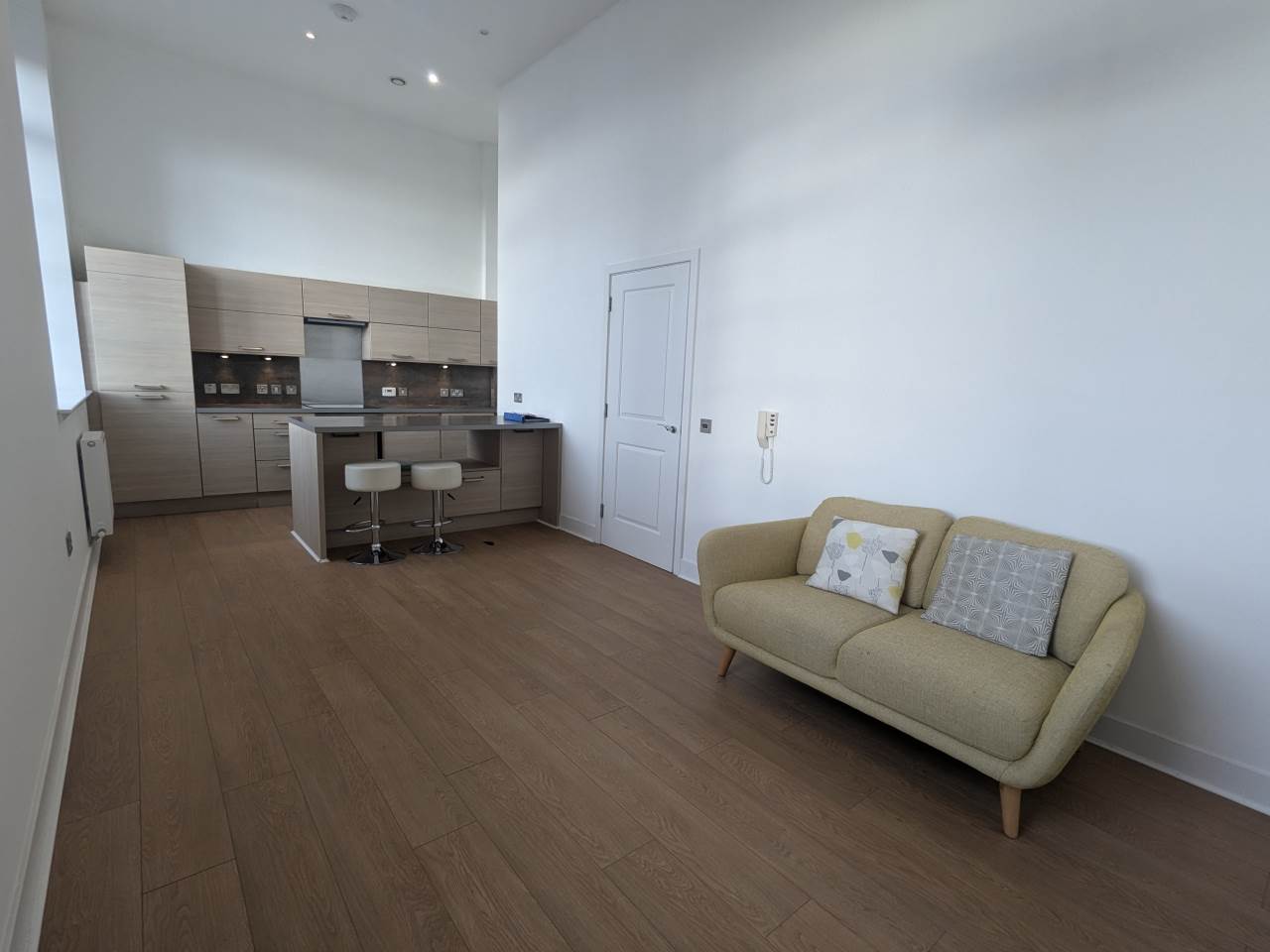 The accommodation comprises a central hallway with a large storage cupboard, a spacious open-plan living/dining area with fitted kitchen, a double bedroom with integrated wardrobe and a contemporary bathroom with three-piece suite and mains shower over bath.