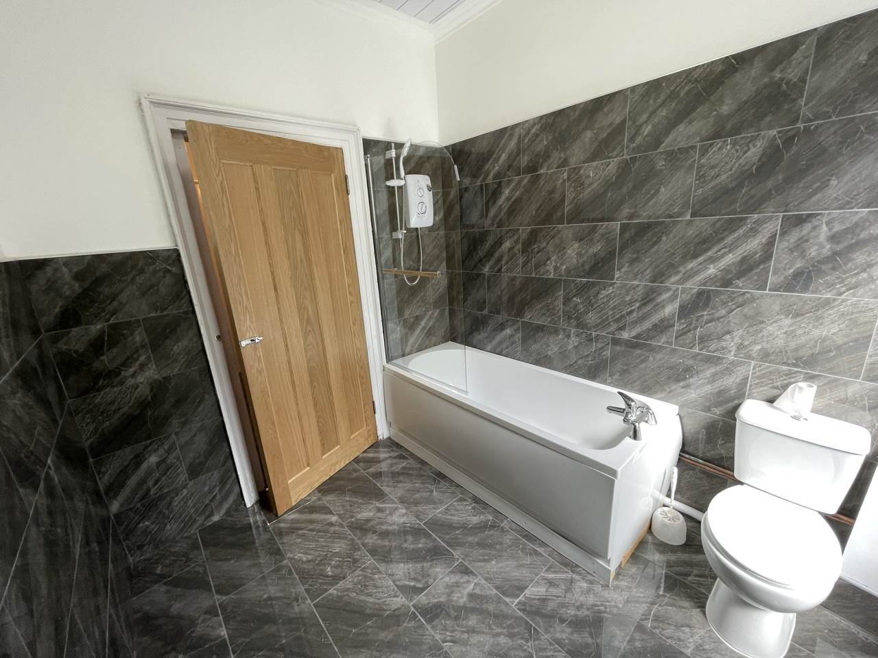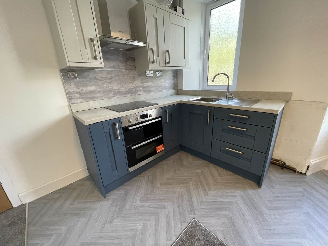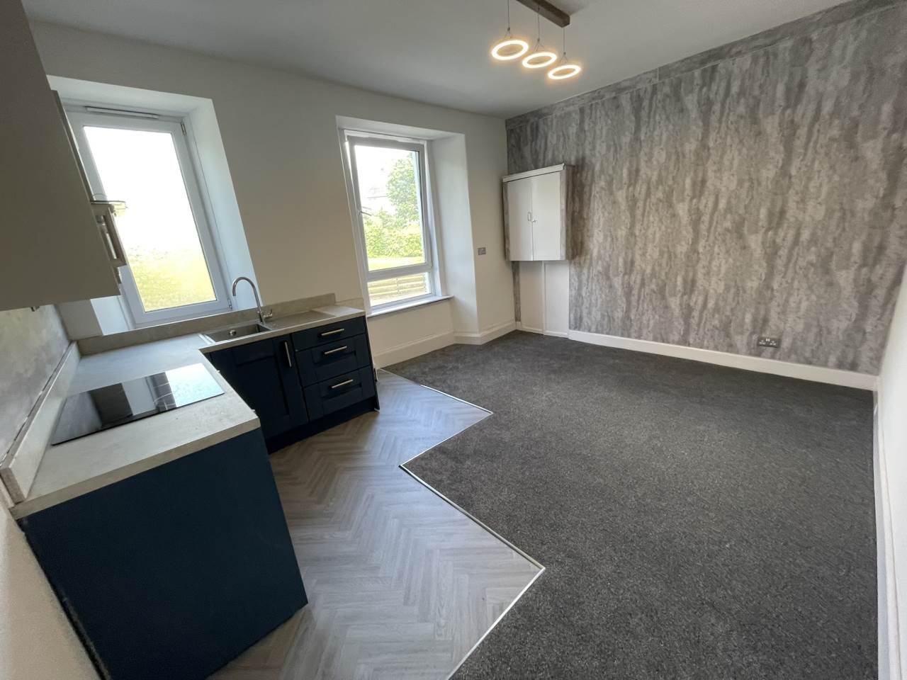 The accommodation comprises three bedrooms, an open-plan kitchen and living area, and a bathroom with shower over bath. The property has been renovated throughout and benefits from modern electric heating and double glazing.